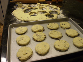 Make sure your surface is floured very well to avoid sticking. Using a 3 inch round biscuit cutter (or any shape cutter you may have) cut out the scones and place on a baking pan that has been sprayed with cooking spray or covered with parchment paper.